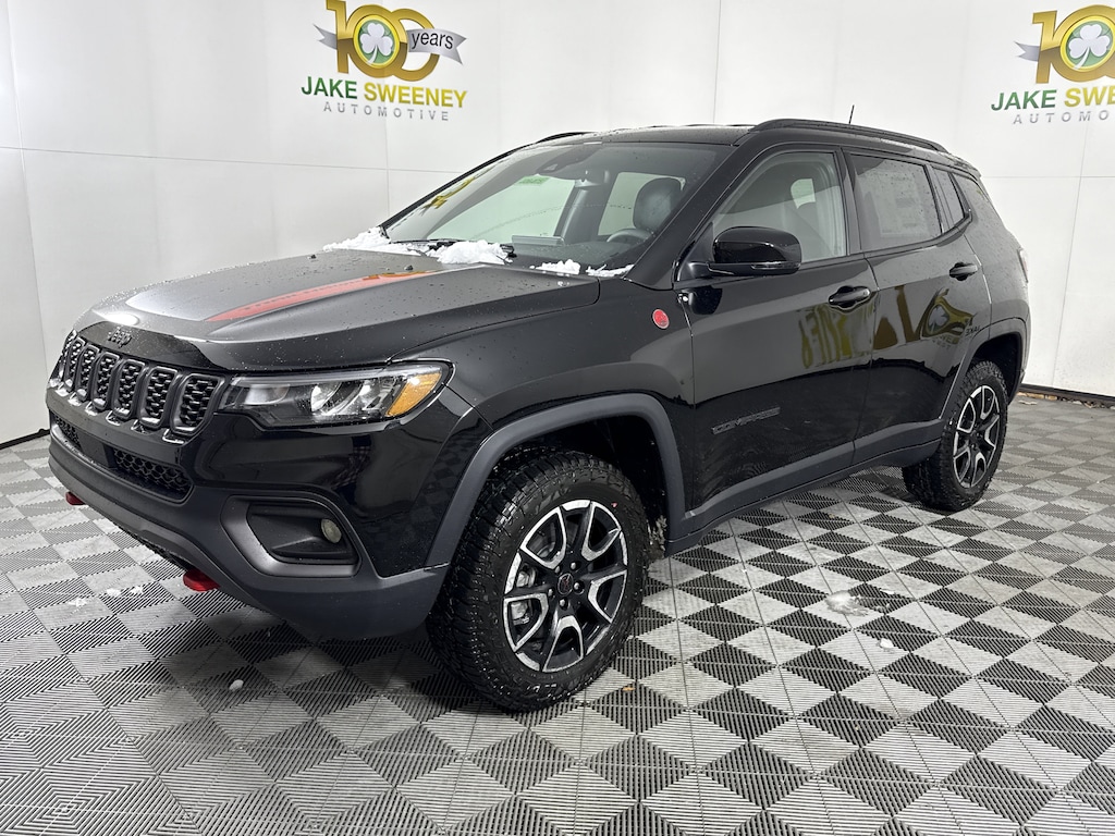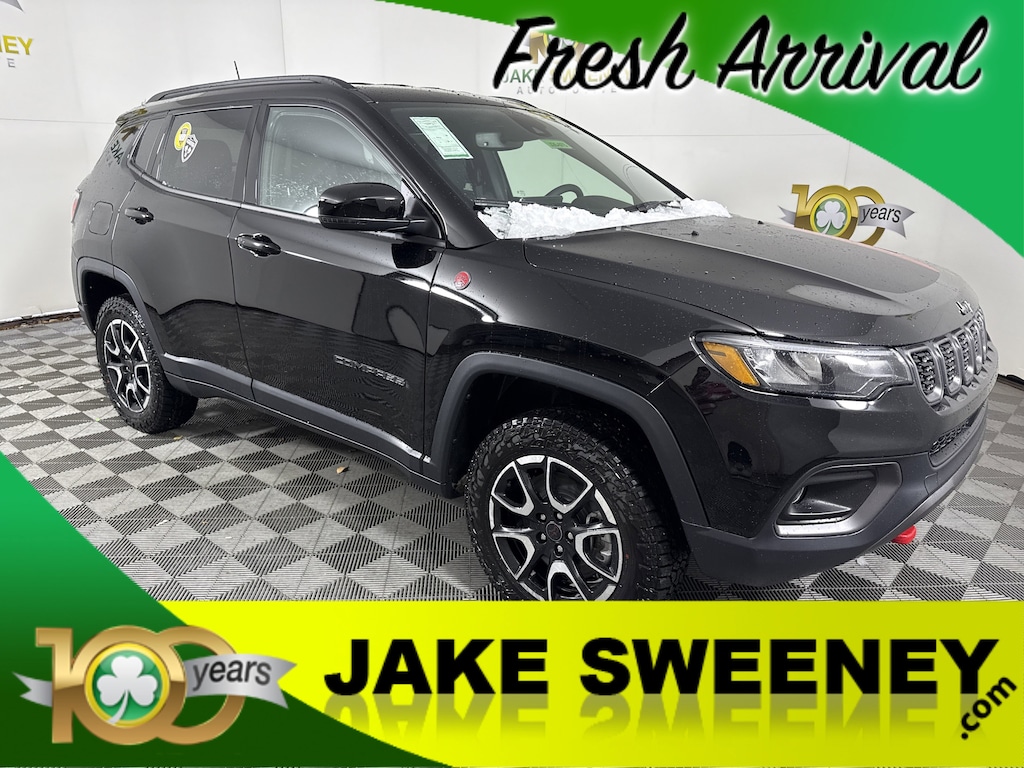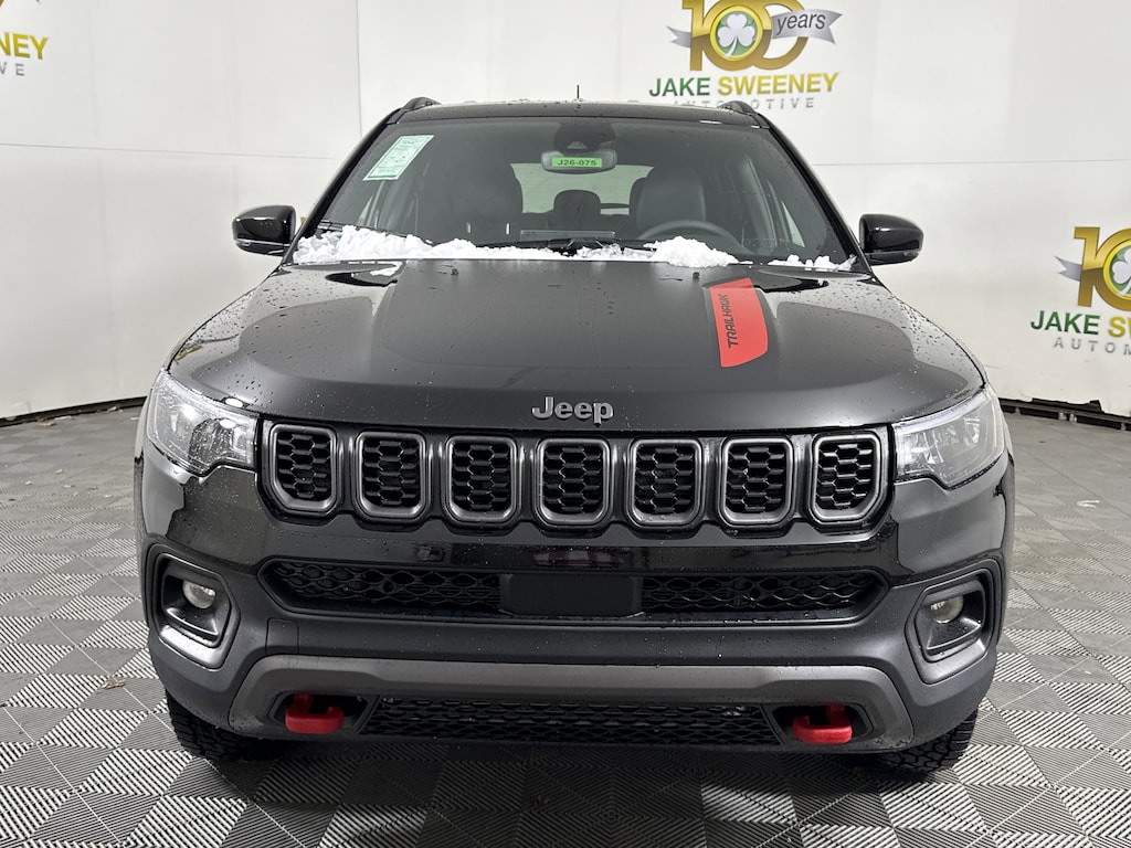 Born to push boundaries, our 2026 Jeep Compass Trailhawk 4X4 commands respect in Diamond Black Crystal Pearl! Powered by a TurboCharged 2.0 Liter 4 Cylinder providing 200hp to an 8 Speed Automatic transmission protected by a robust skid plate. This Four Wheel Drive SUV also has an off-road suspension with a terrain management system to handle adventure where you find it, and it achieves nearly 32mpg on the highway. Modern Jeep style comes into the picture with LED lighting, a black roof, a black hood decal, roof rails, black alloy wheels, tow hooks, and more skid plates for additional underbody protection.