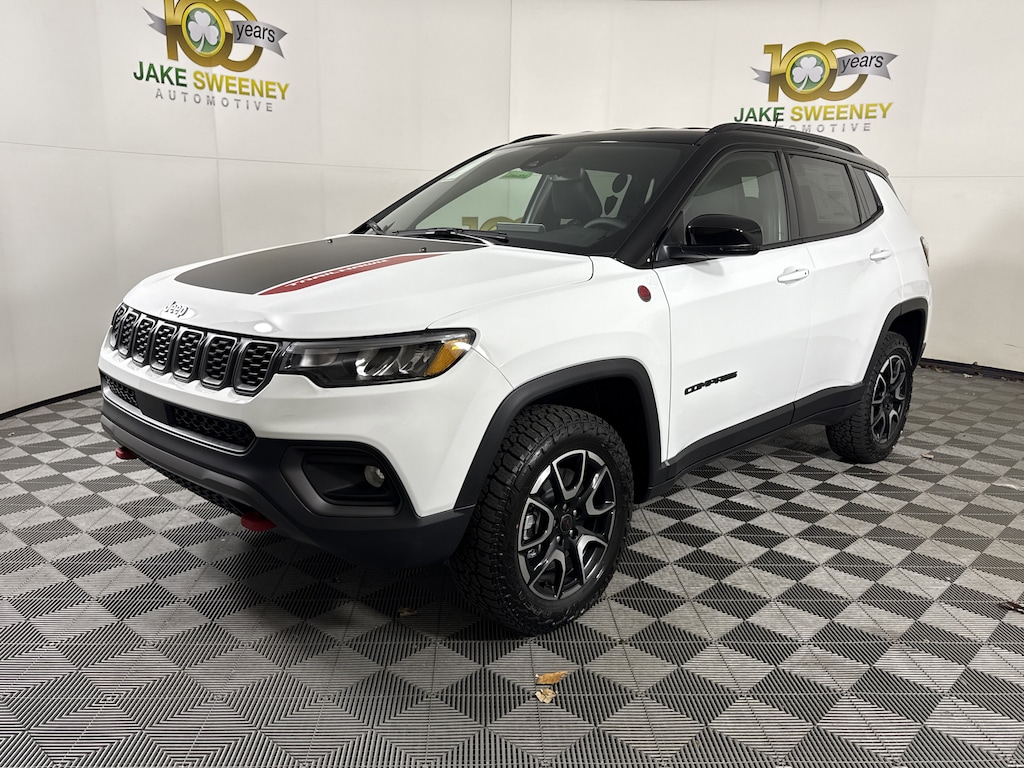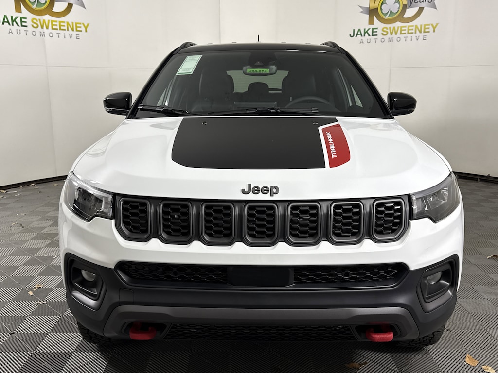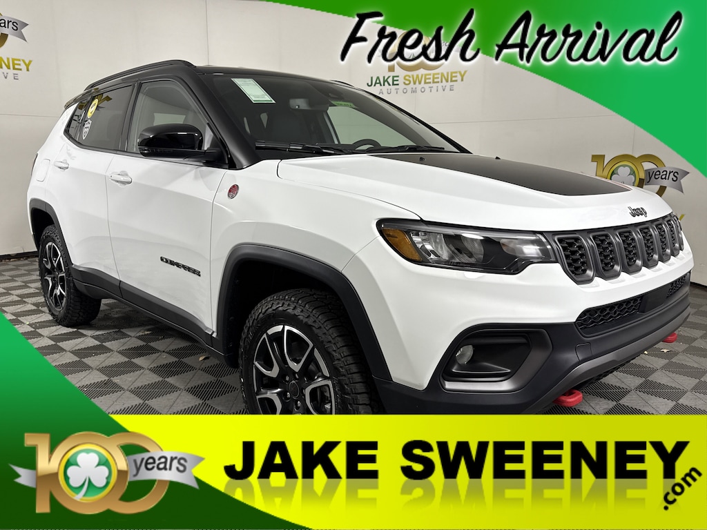 Born to push boundaries, our 2026 Jeep Compass Trailhawk 4X4 commands respect in Bright White! Powered by a TurboCharged 2.0 Liter 4 Cylinder providing 200hp to an 8 Speed Automatic transmission protected by a robust skid plate. This Four Wheel Drive SUV also has an off-road suspension with a terrain management system to handle adventure where you find it, and it achieves nearly 32mpg on the highway. Modern Jeep style comes into the picture with LED lighting, a black roof, a black hood decal, roof rails, black alloy wheels, tow hooks, and more skid plates for additional underbody protection.