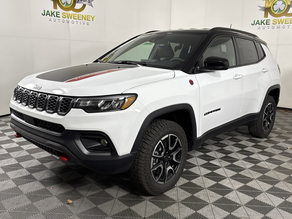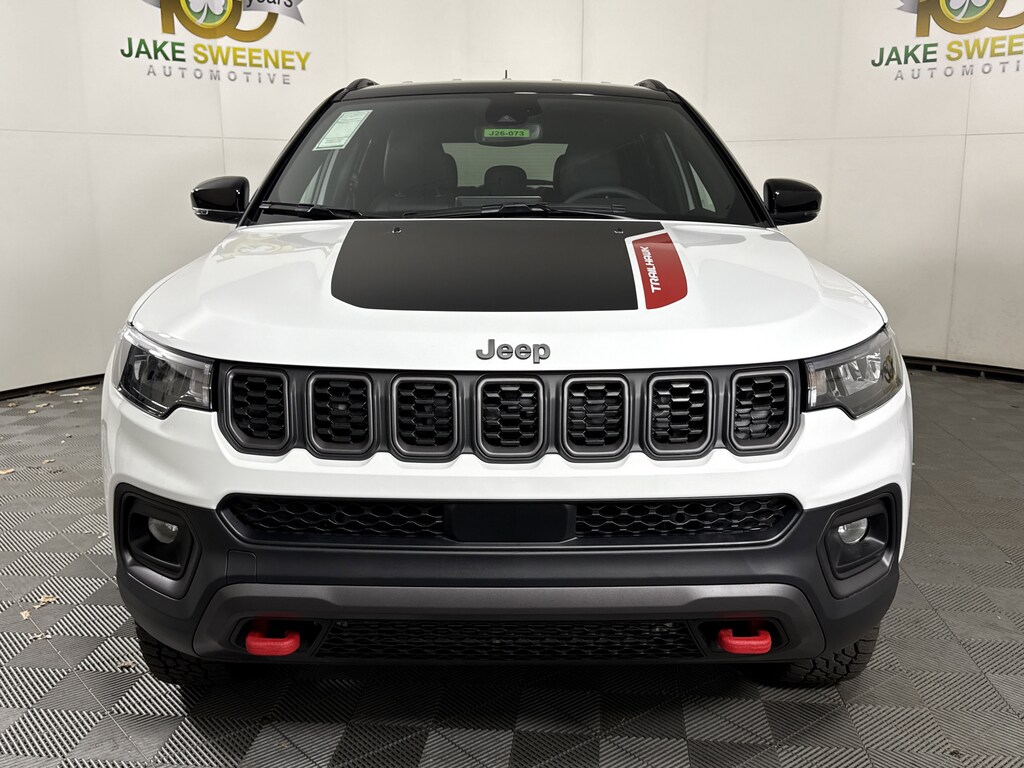Born to push boundaries, our 2026 Jeep Compass Trailhawk 4X4 commands respect in Bright White! Powered by a TurboCharged 2.0 Liter 4 Cylinder providing 200hp to an 8 Speed Automatic transmission protected by a robust skid plate. This Four Wheel Drive SUV also has an off-road suspension with a terrain management system to handle adventure where you find it, and it achieves nearly 32mpg on the highway. Modern Jeep style comes into the picture with LED lighting, a black roof, a black hood decal, roof rails, black alloy wheels, tow hooks, and more skid plates for additional underbody protection.