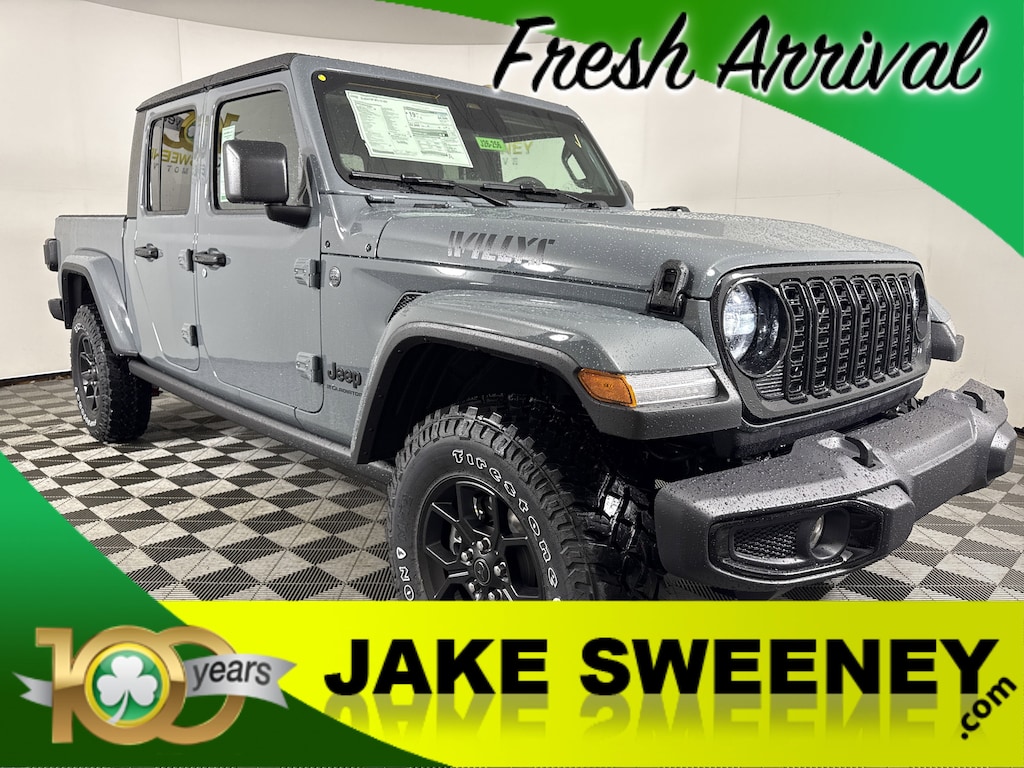 Find your sense of adventure with our 2026 Jeep Gladiator Willys 4X4 in Anvil that provides assured traction and steady control when the pavement ends. Powered by a 3.6 Liter Pentastar V6 supplying 285hp to an 8 Speed Automatic transmission for muscular performance. A limited-slip rear differential, Dana axles, and an off-road suspension combine for trail-ready handling in this Four Wheel Drive truck, which scores 22mpg on the highway with a genuine Jeep exterior. Get a good look at our Gladiator's LED lighting, exclusive Willys decals, black alloy wheels, padded sportbar, cab rock rails, removable soft top, and a Class II bumper hitch so you're ready to tow and go.