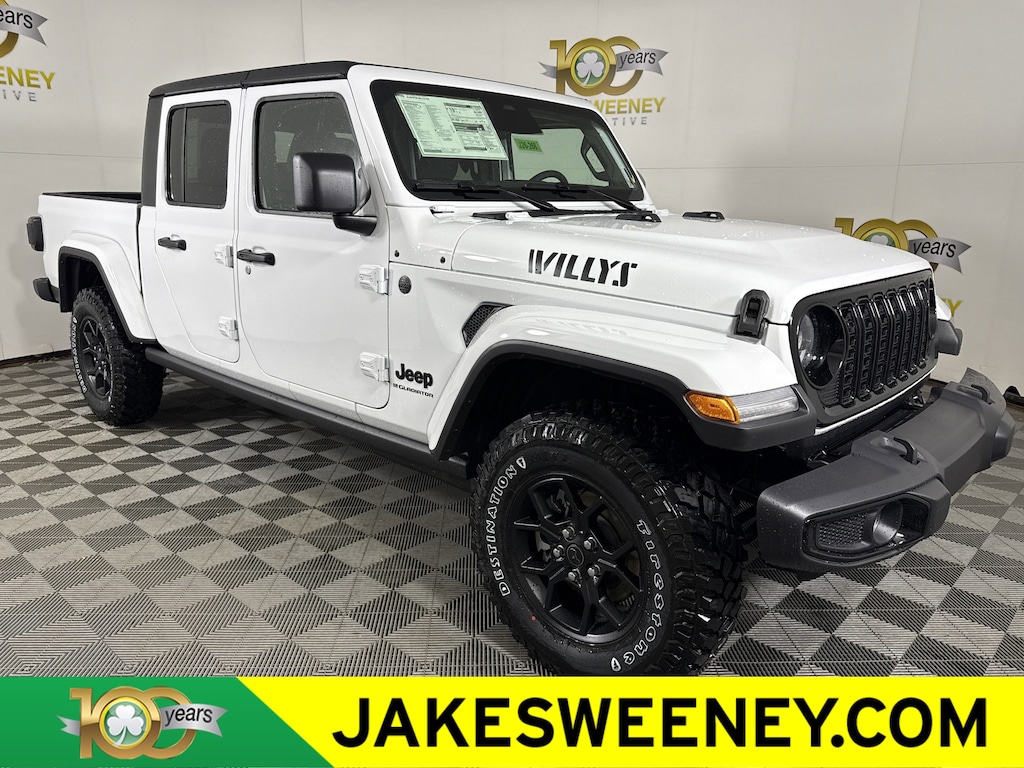 Awaken your sense of adventure with our our 2026 Jeep Gladiator Willys 4X4 with the Convenience Group in Bright White that's set up to handle dirt, gravel, and changing conditions in one powerful package. Powered by a 3.6 Liter Pentastar V6 supplying 285hp to an 8 Speed Automatic transmission for muscular performance. A limited-slip rear differential, Dana axles, and an off-road suspension combine for trail-ready handling in this Four Wheel Drive truck, which scores 22mpg on the highway with a genuine Jeep exterior. Get a good look at our Gladiator's LED lighting, exclusive Willys decals, black alloy wheels, padded sportbar, cab rock rails, removable soft top, and a Class II bumper hitch so you're ready to tow and go.