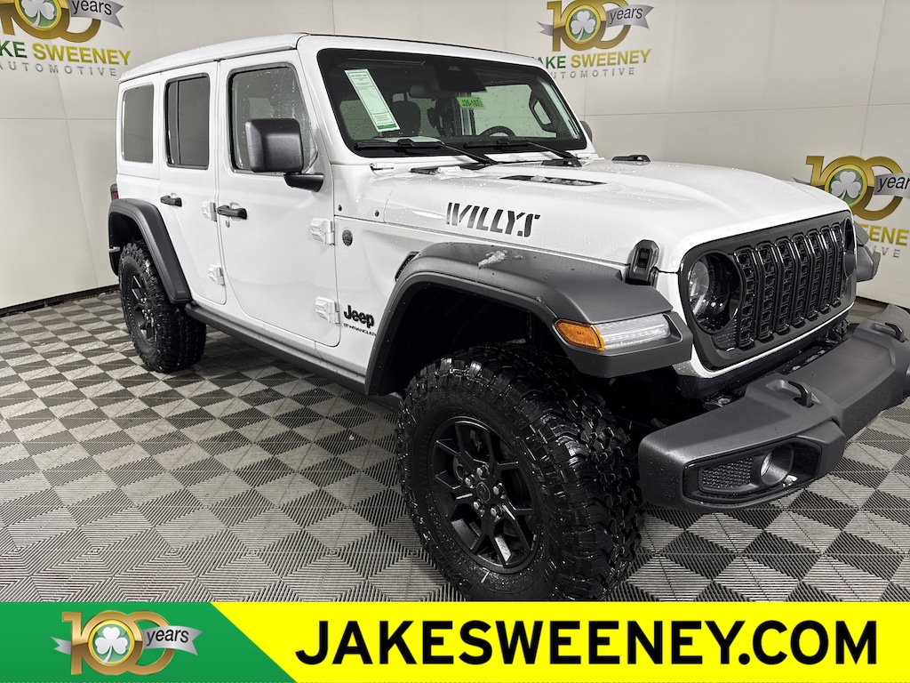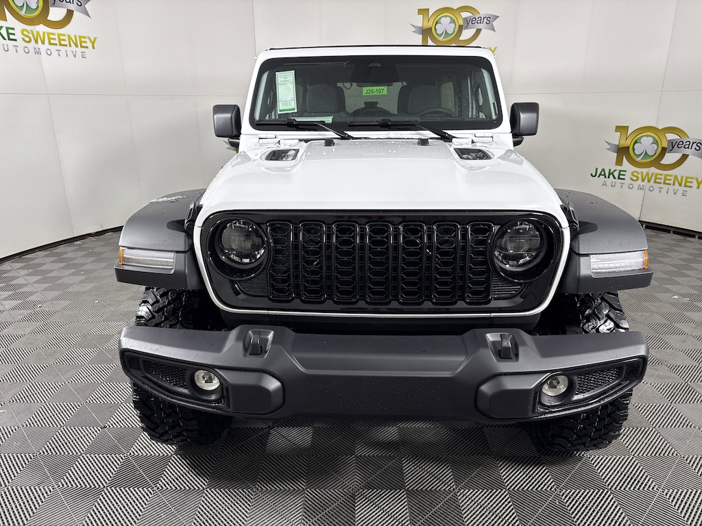 Our 2026 Jeep Wrangler Willys 4 Door 4X4 with the Convenience Pack in Bright White rides with renowned capability that true adventurers love! Driven by a 3.6 Liter Pentastar V6 supplying 285hp to an 8 Speed Automatic transmission with an Off-Road Plus mode for enhanced trail performance. Dana axles and an electronic locking rear differential help you conquer almost any conditions, and this Four Wheel Drive SUV returns nearly 23mpg on the highway. Eye-catching Willys hood graphics help our Wrangler grab attention with LED lighting, fog lamps, alloy wheels, fender flares, a sport bar, and a fantastic open-air driving experience when you drop the top, fold down the Gorilla Glass windshield, and remove the doors!