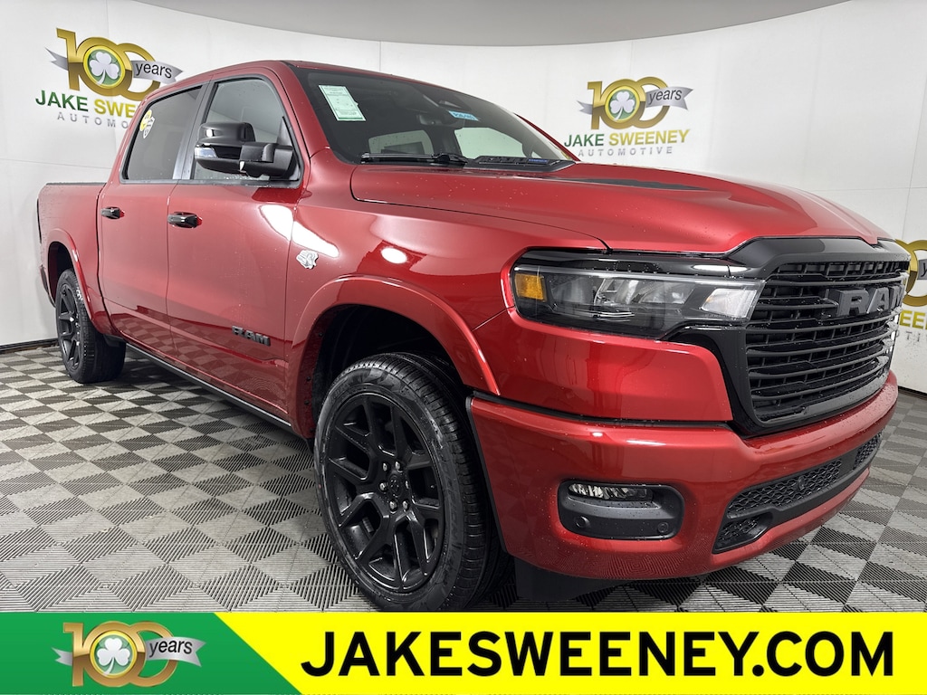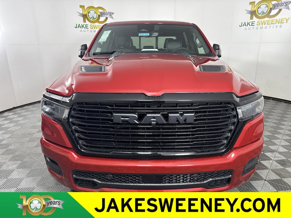 Our stunning 2026 RAM 1500 Laramie Crew Cab 4X4 Night Edition with the Level 2 Equip Group is designed to be noticed in Molten Red. Powered by a 5.7 Liter eTorque HEMI V8 with a 48V Mild-Hybrid system delivering 395hp to an 8 Speed Automatic transmission for dealing with heavy trailers and large payloads. This Four Wheel Drive truck is also easy to handle in town and sees nearly 24mpg on the highway. A high-capability head-turner, our RAM showcases LED lighting, fog lamps, stylish fender flares, the Night Edition's 22-inch wheels, a sport performance hood, body-colored bumpers, a Class IV hitch receiver, heated power-fold mirrors, and a 400W inverter.