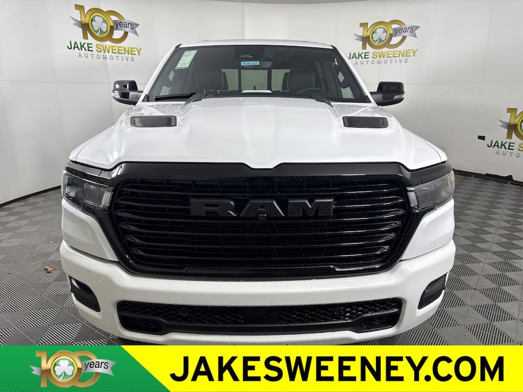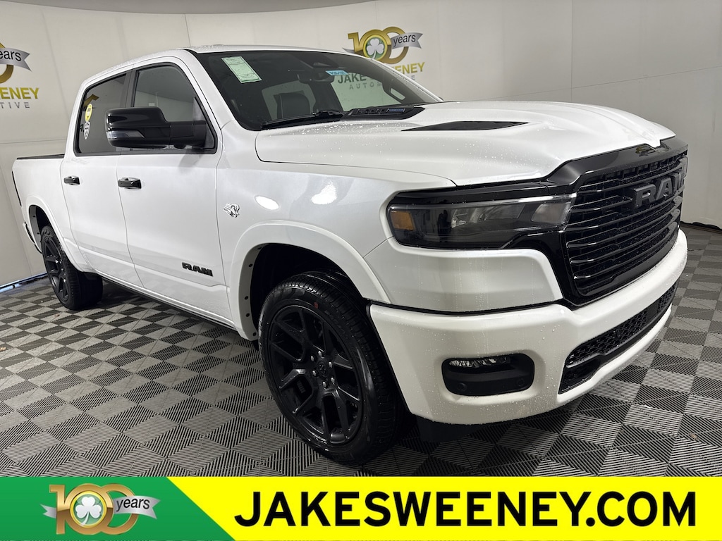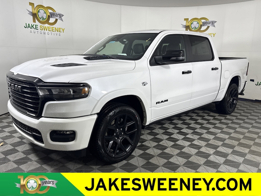 Roll up in our 2026 RAM 1500 Laramie Crew Cab 4X4 Night Edition that inspires confidence in Ivory White Tri-Coat Pearl with the Level 2 Equipment Group. Powered by a 5.7 Liter eTorque HEMI V8 with a 48V Mild-Hybrid system delivering 395hp to an 8 Speed Automatic transmission for dealing with heavy trailers and large payloads. This Four Wheel Drive truck is also easy to handle in town and sees nearly 24mpg on the highway. A high-capability head-turner, our RAM showcases LED lighting, fog lamps, stylish fender flares, power tailgate, power deployable running boards, the Night Edition's 22-inch wheels, a sport performance hood, body-colored bumpers, a Class IV hitch receiver, heated power-fold mirrors, a spray-on Bedliner, a panoramic sunroof, and a 400W inverter.