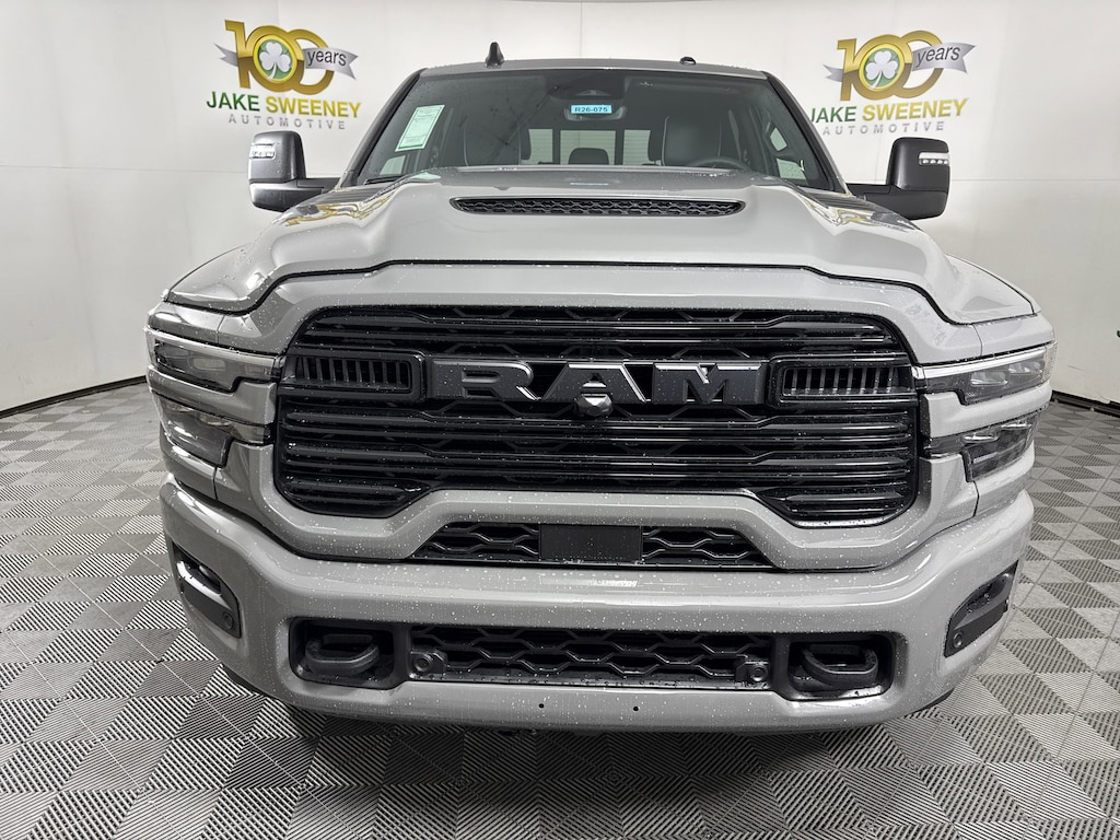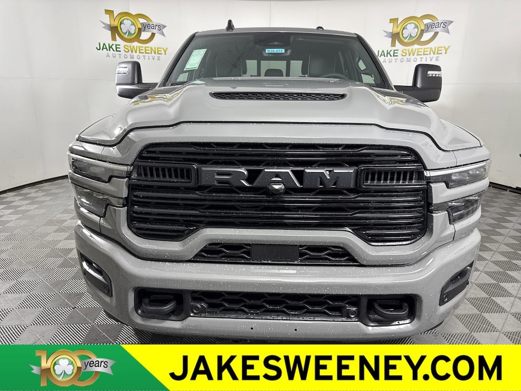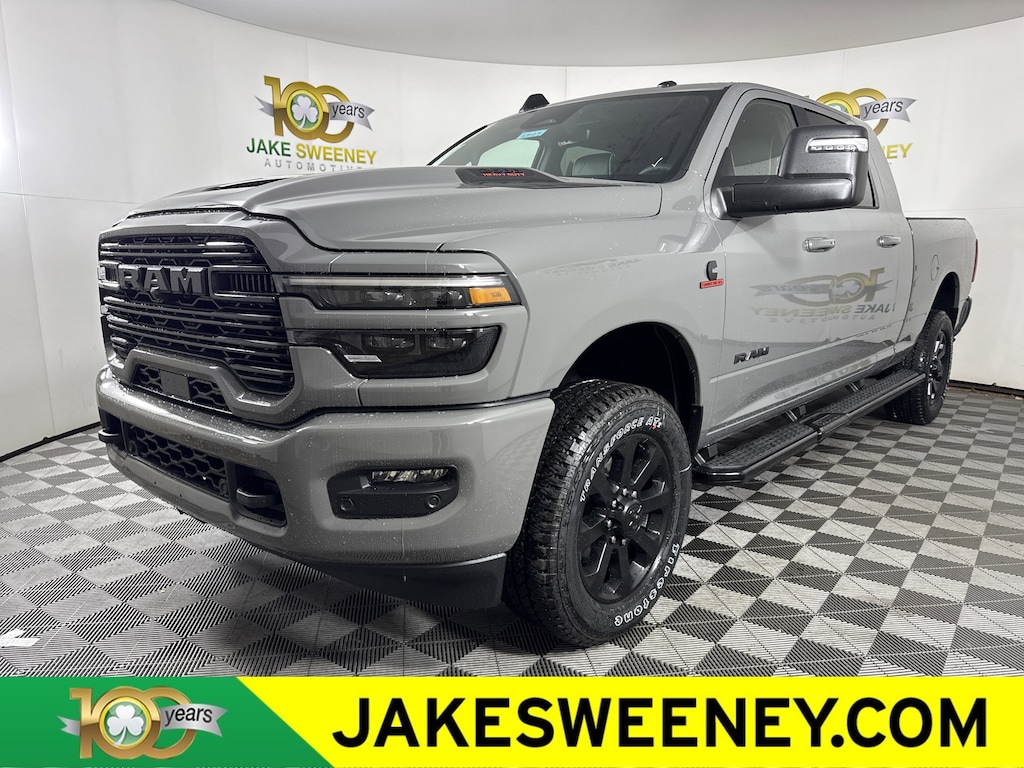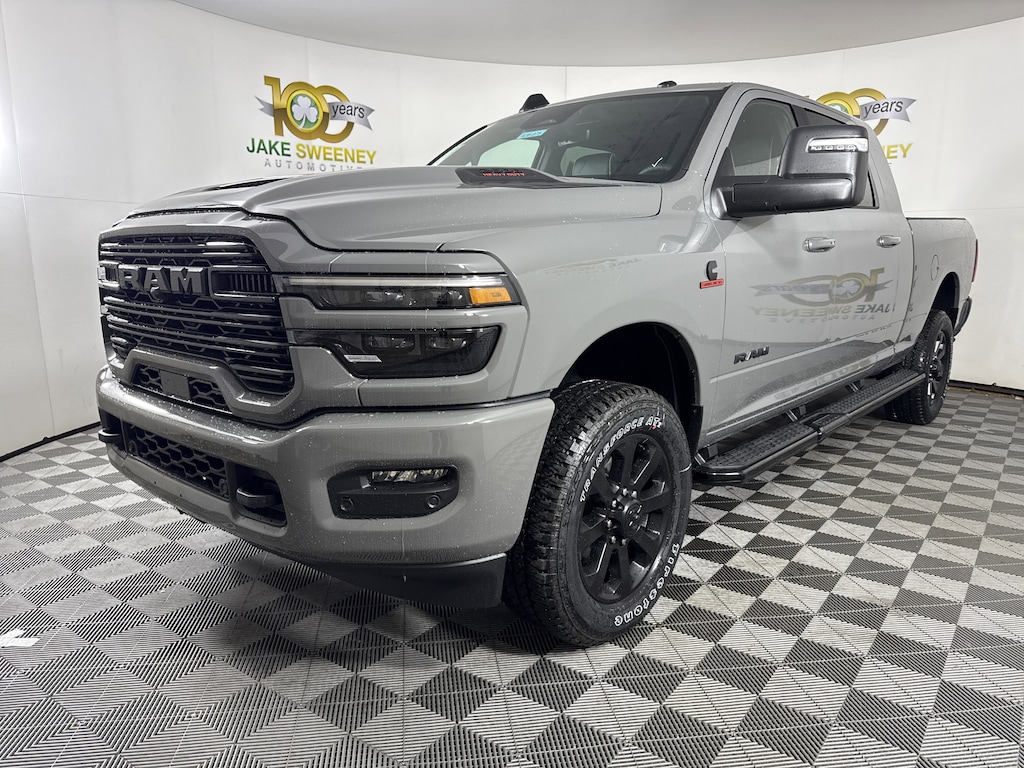 Dominate with diesel power in our 2026 RAM 2500 Laramie Mega Cab 4X4 in Ceramic Grey Clearcoat, where upscale comfort meets heavy-duty muscle. Motivated by a High-Output TurboCharged 6.7 Liter Cummins Diesel 6 Cylinder serving up 430hp and 850lb-ft of torque to a 6 Speed Automatic transmission for job-friendly payload and trailer ratings. This Four Wheel Drive truck rides on a heavy-duty suspension for confident capability. Strong and stylish, our RAM features heated power trailer mirrors, a 115V/400W outlet, a remote tailgate release, a sunroof, and LED lighting for its Class V receiver hitch.
