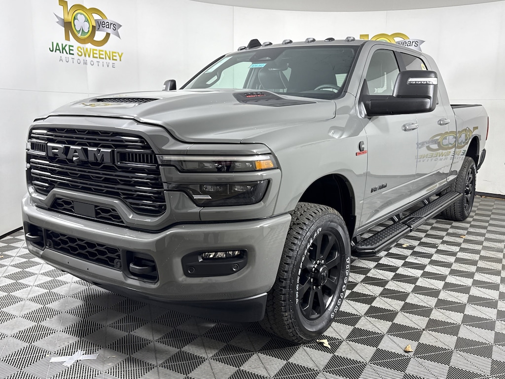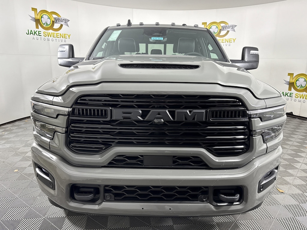 Dominate with diesel power in our 2026 RAM 2500 Laramie Crew Cab 4X4 in Ceramic Grey Clearcoat, where upscale comfort meets heavy-duty muscle. Motivated by a High-Output TurboCharged 6.7 Liter Cummins Diesel 6 Cylinder serving up 430hp and 850lb-ft of torque to a 6 Speed Automatic transmission for job-friendly payload and trailer ratings. This Four Wheel Drive truck rides on a heavy-duty suspension for confident capability. Strong and stylish, our RAM features heated power trailer mirrors, a 115V/400W outlet, a sunroof, a remote tailgate release, and LED lighting for its Class V receiver hitch.