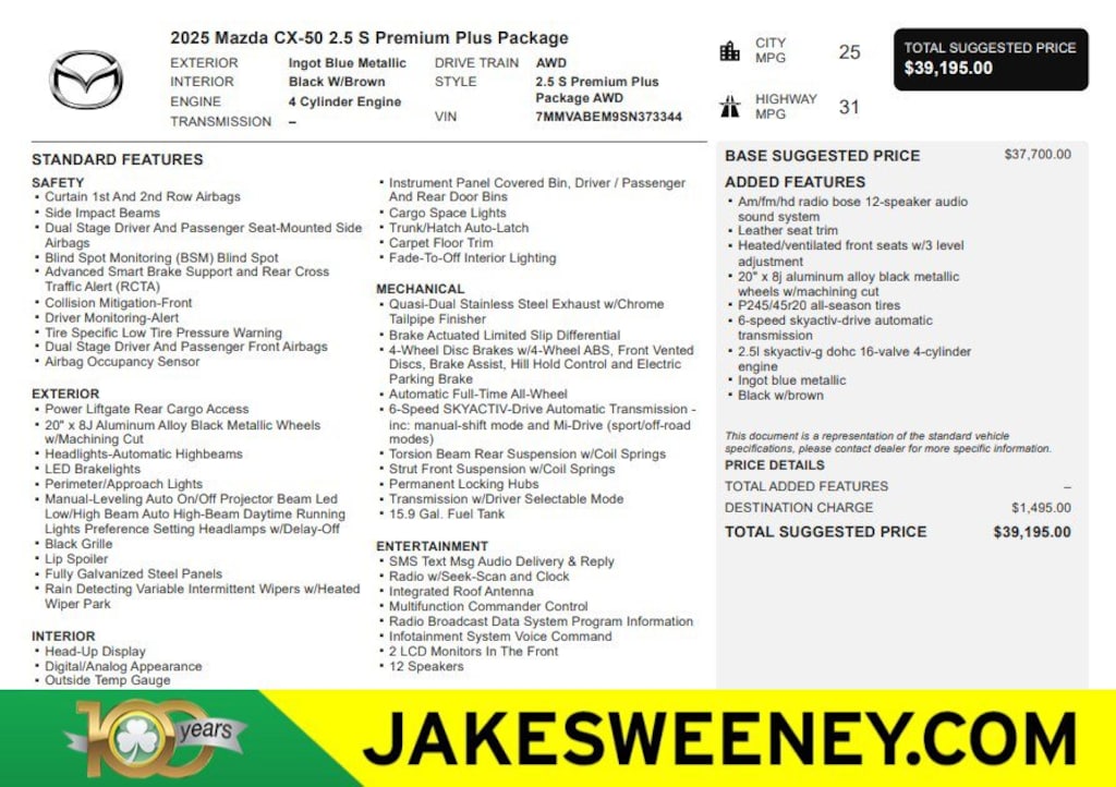 Jake Sweeney Is Here to Help! If you are in need of a new or used vehicle, we are offering you the ability to shop online and have your vehicle delivered to your home. Blue Metallic 2025 Mazda CX-50 2.5 S Premium Plus Package AWD 6-Speed Automatic SKYACTIV® 2.5L 4-Cylinder DOHC 16V